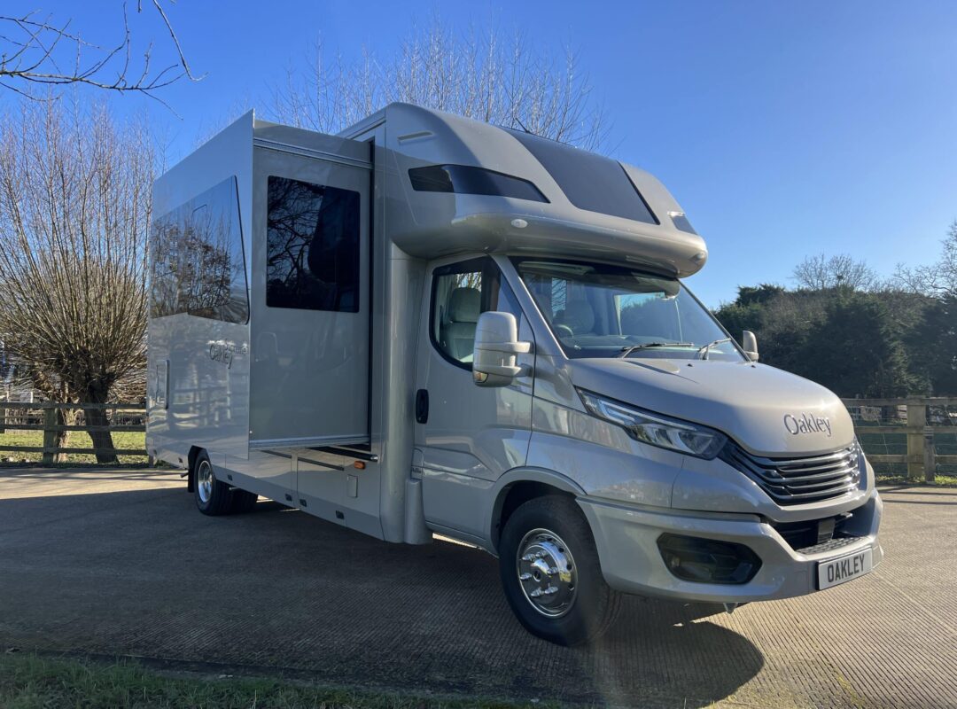 New and unregistered 2025 Oakley 2 Stall Horsebox | Luxury Slide Out Living Accommodation | Berth Above Luton | Kitchen Facilities | Grey Leather | TV System | Shower Room | Diesel Fuelled Heating System | Forward Facing Stalls | Breast Bar Tube Partitions | Adjustable Padded Partition | Rear Shelved Tack Storage Locker | External Awning | External Tie Rings | Nearside Side Ramp Access | Side Jockey Door | 2025 Iveco Turbo Daily 70 C21 | 8 Speed Semi Automatic Gearbox | Horse and Reversing Cameras | Delivery Miles | 7,200kg GVW. | Finished in Metallic Grey |