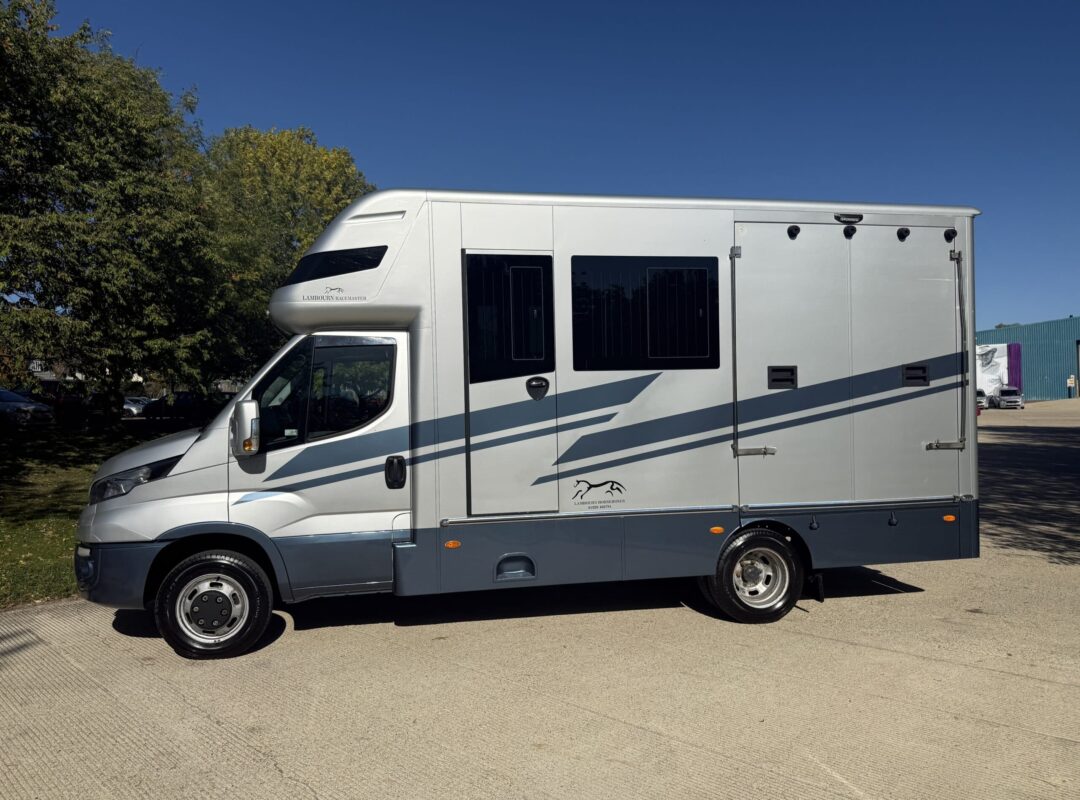 2015 Oakley Racemaster 2 Stall Horsebox |  Forward Facing Stallion or Chest Bar Stalls | Adjustable Padded Partition | Interior Tack Storage | Berth Above Luton | Nearside Side Ramp Access | Side Jockey Door | 2015 Iveco Turbo Daily 45C15 | 6 Speed Manual Gearbox | 22,250 Miles | 4,600kg GVW. | Sat Nav and Media System | Black Leather Cab Seats | Finished in High Gloss Silver with Blue Livery |