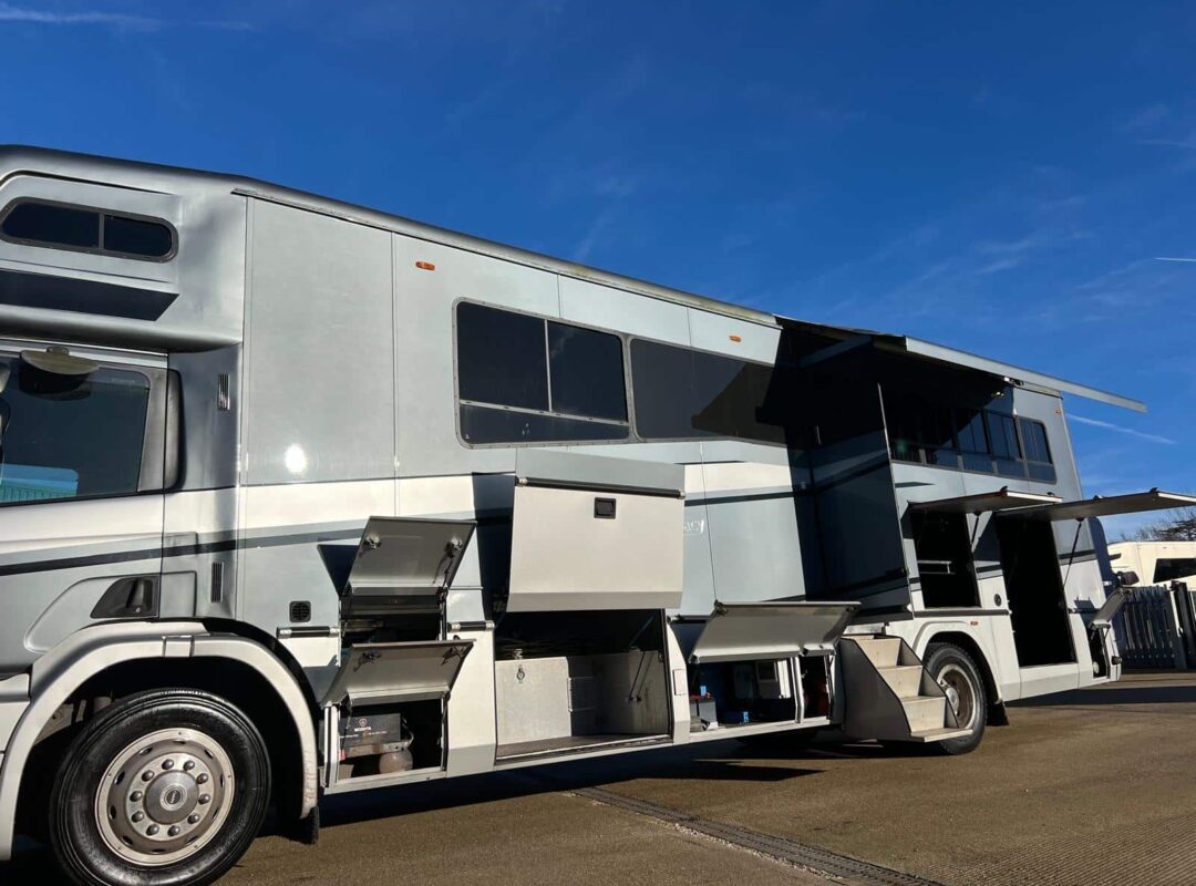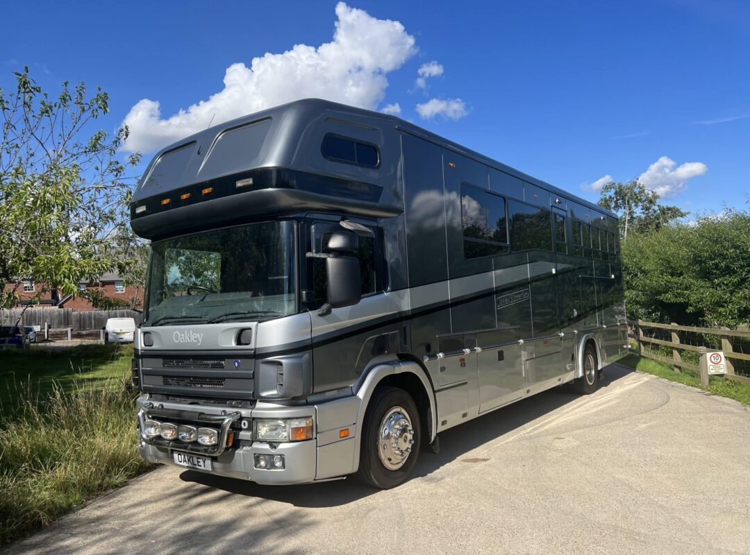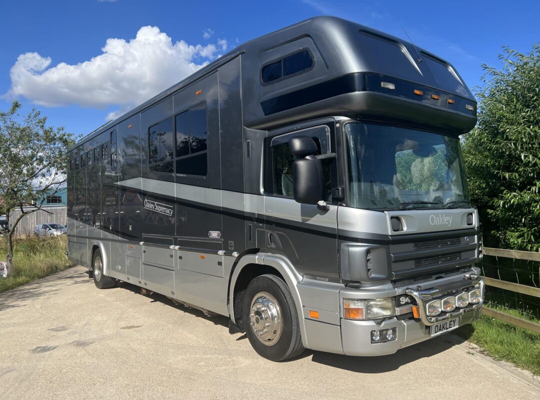 2004 Oakley Supreme 4 Stall Horsebox | Luxury Slide Out Living Accommodation | Six Berth | High Gloss Cherry Wood Furniture | Dark Grey Leather with White Piping | Extensive Kitchen Facilities | Heating System | TV with DVD Player | Full Shower Area | Separate Hallway Area | Diesel Fuelled Generator | Three Adjustable Divisions | Underfloor Storage and External Tack Locker | Additional Shelved Storage and Skirt Lockers| 2004 (04) Scania 94D 260HP | 8-Speed Manual Gearbox | Horse and Reversing Cameras | Horsebox From New | 58,500 miles | 18,000kg GVW. | Finished in Metallic Grey Paintwork |