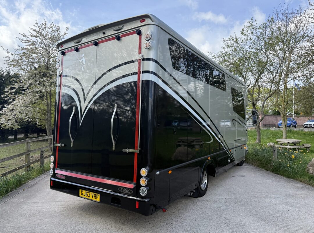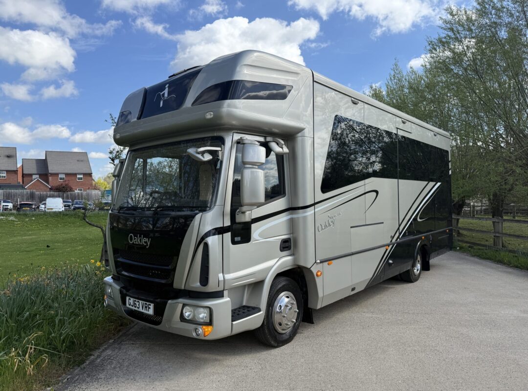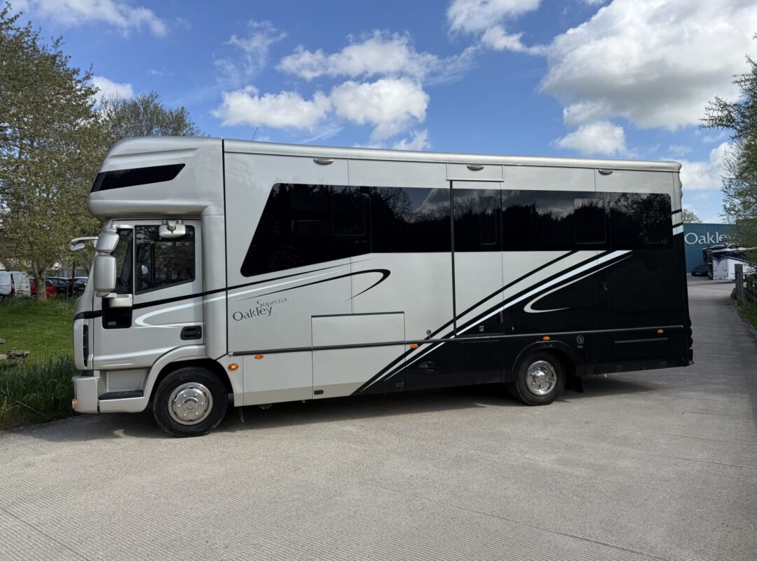 2013 Oakley Supreme 2/3 Stall Horsebox | Luxury Open Plan Living Accommodation | Satin Walnut Wood Furniture | Ecru Leather | Kitchen Facilities | Heating System | TV with Speaker System | Full Shower Area | Electric Start Diesel Fuelled Generator | Underfloor Storage | Iveco ML75 E18 | Semi Automatic Gearbox | Two Padded Adjustable Divisions | Alpine Entertainment System | Horse and Reversing Cameras | 44,500 Miles | 7,500kg GVW. | Finished in High Gloss Luxor with Black Artwork