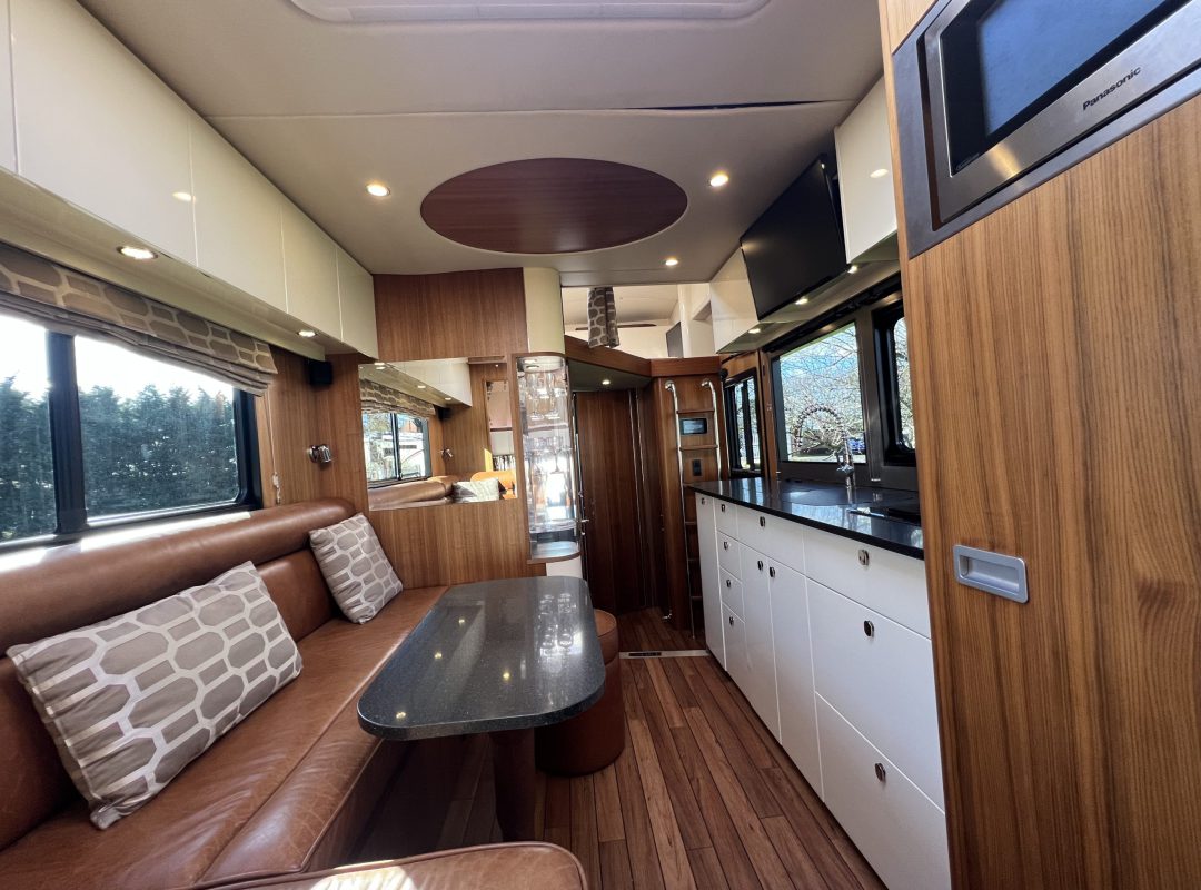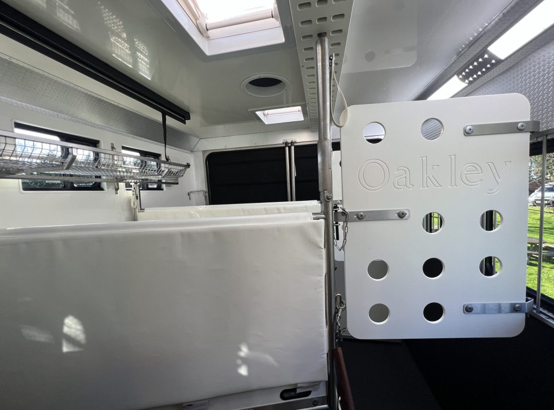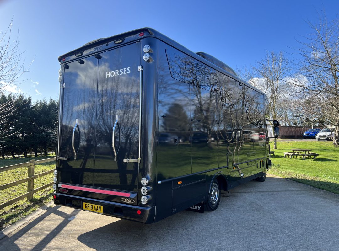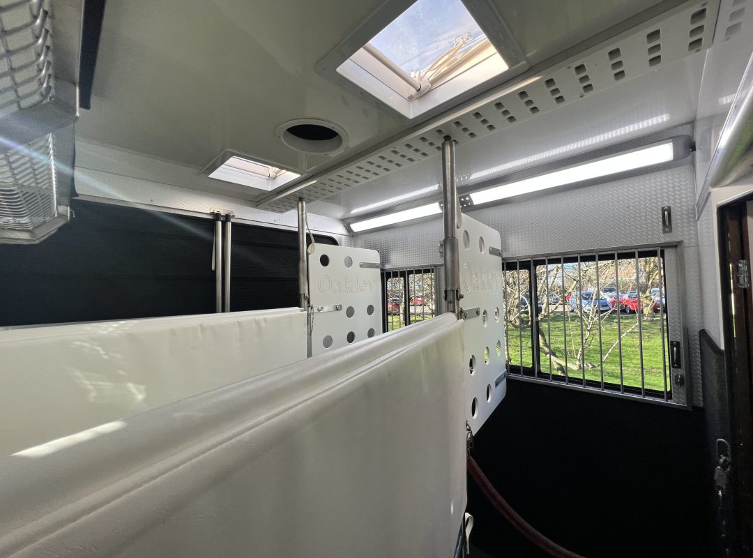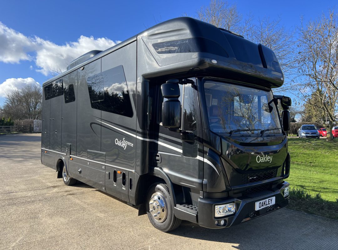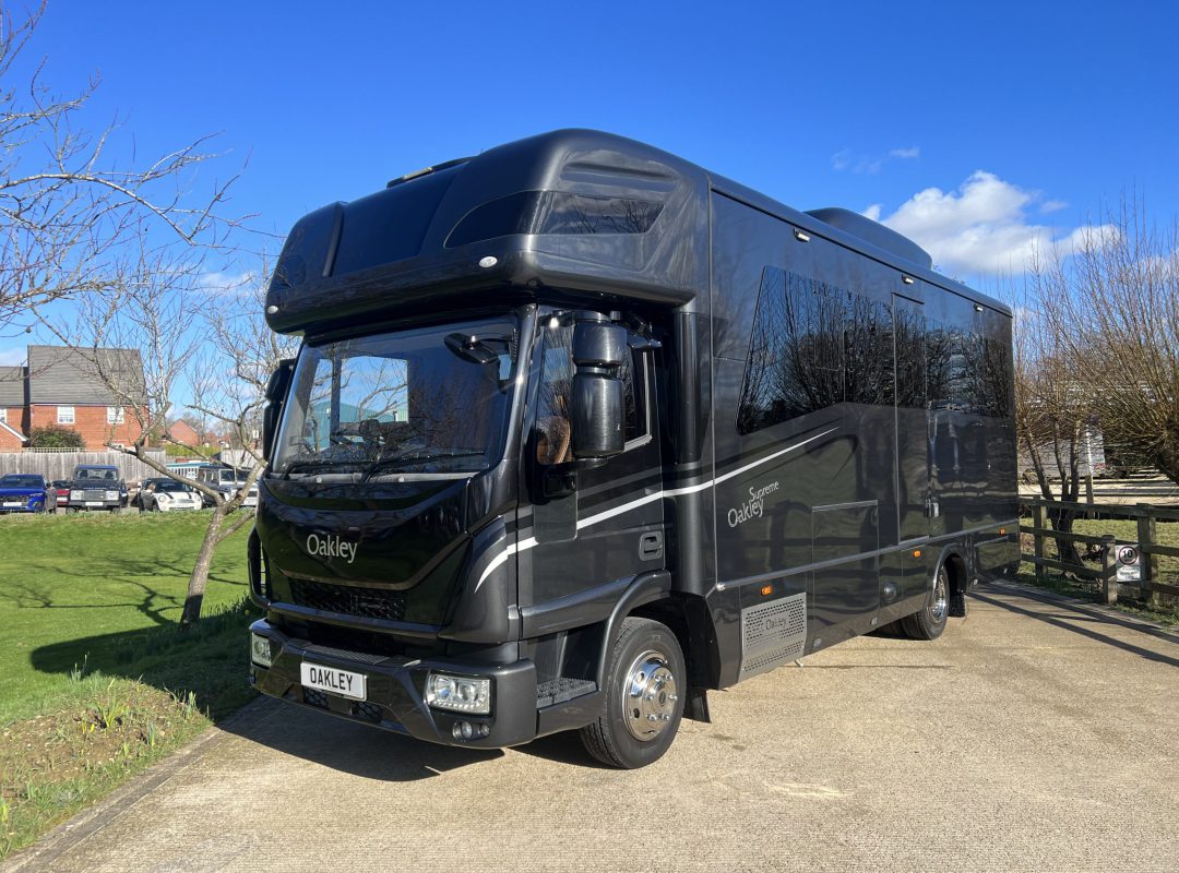 2019 Oakley Supreme 2/3 Stall Horsebox | Luxury Open Plan Living Accommodation | Five Berth Sleeping Accommodation | Satin Walnut Wood Furniture | Oakley Pearl Upper Units | Distressed Tan Leather | Kitchen Facilities | Heating System | TV and DVD Player | Full Shower Area | Fixed Roof Pod with TV | Electric Start Diesel Fuelled Generator | Two Padded Divisions | Underfloor Storage | External Wash Down Hose| External Tie Up with Cribbing Blankets | 2019 (19) Iveco ML75E21 | Semi-Automatic Gearbox | Infotainment Media System | Horse and Reversing Cameras | Horsebox Only Mileage | 29,000 Miles | 7,500kg GVW. | Finished in Metallic Dark Grey with Black and Silver Artwork |