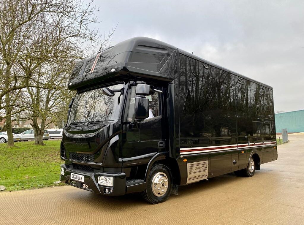 2022 Oakley Supreme 2/3 Stall Horsebox | Luxury Open Plan Living Accommodation | Four Berth Sleeping Accommodation | Graphite Grey/ Black wood veneer Furniture | Oakley Graphite Grey wood veneer to Upper Units | Black Leather Interior | Kitchen Facilities | Heating System | TV and DVD Player | Full Shower Area | Electric Start Diesel Fuelled Generator | Two Padded Divisions | Underfloor Storage | 2022 (71) Iveco ML75E21 | Semi-Automatic Gearbox | SAT NAV, Apple Play, Radio, Bluetooth System | Horse and Reversing Cameras | Horsebox Only Mileage | 14,000 Miles | 7,500kg GVW. | Finished in Metallic Jet Black with Lineage