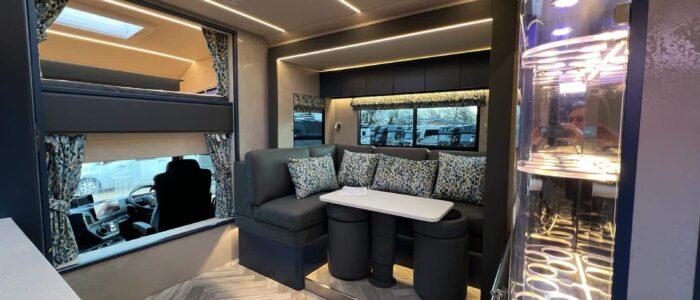 - Dark grey upholstered L shaped seating, with matching cab seats.